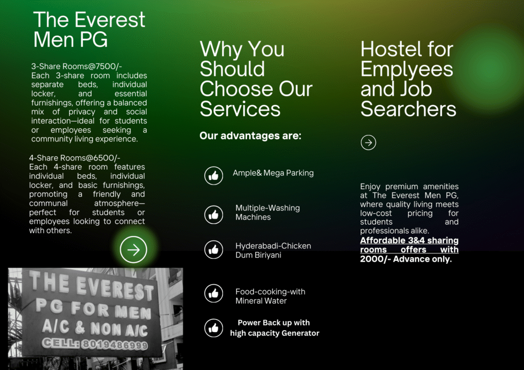 The Everest Men PG” is the No.1 men’s hostel in Gowlidoddy, offering comfortable rooms, maitain Hygienic Food and a safe, friendly environment.